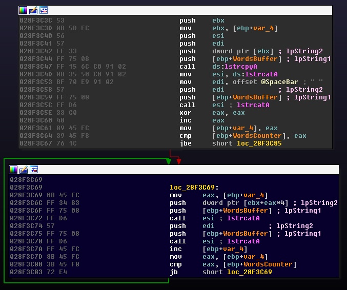 After that, we are going to copy each of those strings, override the original buffer with them, and add a space bar right after. This should result the matching strings being one after another ordered in that buffer. However, the first copy is the reason for the problem. We are first of all copying the original word over itself using 'lstrcpy', resulting in the same buffer.